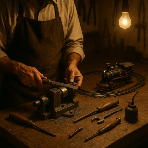 Con el negocio andando firme, Alfonso empezó a inventar en sus ratos de calma. Tenía manos de virtuoso y paciencia de relojero cuando se metía en esos avatares. Se propuso construir un torno con lo que había y lo que pudo comprar: ángulos metálicos, un chuck de tres garras, un motor eléctrico modesto y mucha imaginación. El torno quedó chico pero firme, y sirvió por años. Allí, en esa esquina de taller que olía a aceite y limadura, hizo piezas mínimas, arregló herramientas y, un día, usando lámina de “hoja de lata”, tijeras industriales y su torno, fabricó un hermoso tren a escala, con todo y vías. Funcionaba de maravilla: rueda limpia, engrane hábil, pequeño motor en la locomotora, un avance que parecía respiración.