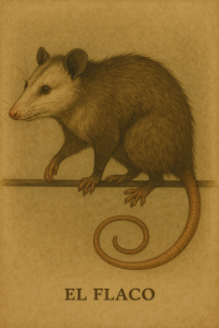 Salió El Flaco, un tlacuache de baja estofa, con la cola desnuda en aro. De flaco tenía el apodo y de tlacuache, el talento heredado: era experto en hacerse el muerto con una convicción que habría emocionado a cualquier maestro de teatro. Su olfato, en cambio, era bastante discreto; confundía a veces un aroma de fruta pasada con cualquier cosa derramada en la cuneta. Lo que lo salvaba —a él y a varios más— era la vista: más que aguda, puntillosa. Veía el brillo de un alambre, el destello de un ojo de gato, el mínimo temblor de una rama en la oscuridad. Gracias a eso se había librado de más de un ataque nocturno inesperado, y en la barranca se le respetaba no por su naríz, sino porque siempre parecía haber visto el peligro medio segundo antes.