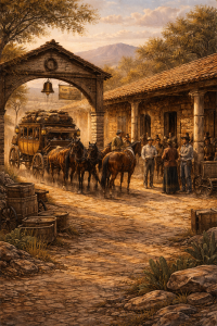 La diligencia, vista de cerca, no tenía nada de elegante. Era una caja de madera reforzada con herrajes, alta sobre sus ruedas para no morder tanto el lodo; un carruaje pensado para resistir, no para lucirse. Dentro, el banco era duro, y el aire se volvía una mezcla de polvo, sudor y cuero curtido. En el exterior, sobre la diligencia, lo que llamaban: baca, iban bultos amarrados con cuerdas: fardos, bolsas, algún cajón, pertenencias envueltas en manta. Todo vibraba; hasta el pensamiento vibraba. Y el viaje se medía por postas, no por leguas: cada cierto trecho —cuando los animales ya no daban más o cuando el camino lo exigía— se paraba a cambiar el tiro. A veces era una parada breve: agua, un mendrugo, un apretón de cinchas, un vistazo rápido a quién entra y quién sale. Otras, la posta era un pequeño mundo: corral, pilas de agua, paja, un cuarto con banco y mesa manchada, una olla con algo tibio si había suerte, un tenderete donde vendían pan, fruta o aguardiente, y un rincón donde se oían noticias como se oyen los cuchicheos en la iglesia: en voz baja, sin mirar a los ojos. En esas paradas uno podía encontrar de todo: arrieros que venían de lejos con cara de pocas palabras, soldados o milicianos de paso, comerciantes con prisa, viajeros con miedo y viajeros con secretos. Y, sobre todo, podía encontrarse la misma regla: no hacerse notar, no preguntar demasiado, no mirar demasiado.