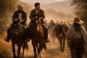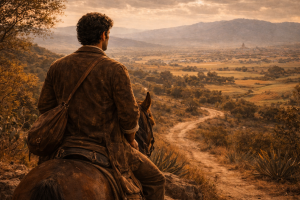 No parecía hacerlo con prisa. Sentado junto a una mesa de madera oscura, miraba el movimiento del lugar con la calma de quien sabe que en los caminos del mundo conviene primero entender el ritmo de las cosas antes de decidir el propio. En el patio entraban y salían recuas de mulas cubiertas de polvo. Los arrieros gritaban órdenes breves mientras los mozos corrían de un lado a otro llevando agua o maíz para los animales. De cuando en cuando llegaba alguna carreta pesada, seguida por viajeros que bajaban lentamente, estirando la espalda después de largas jornadas.