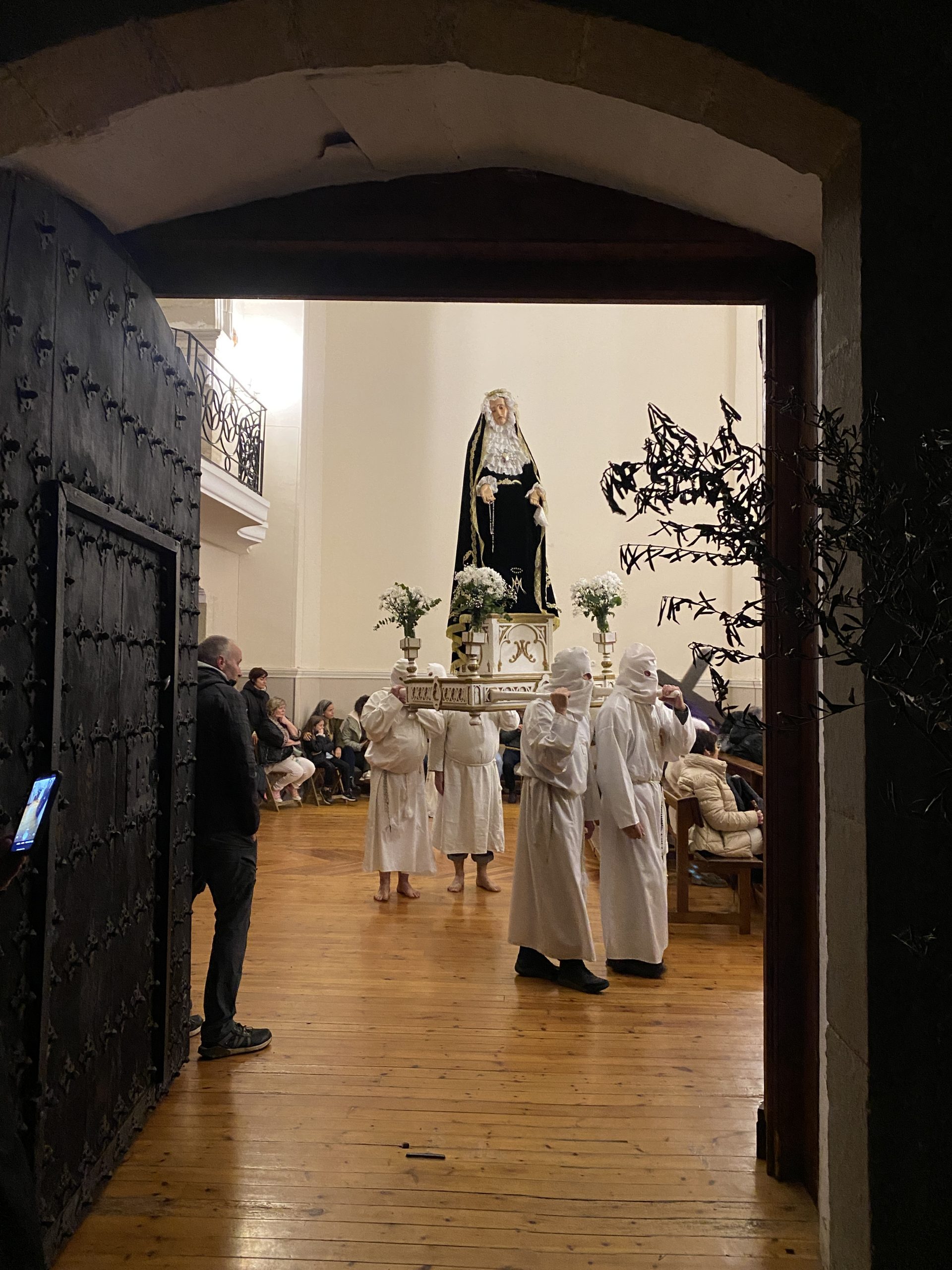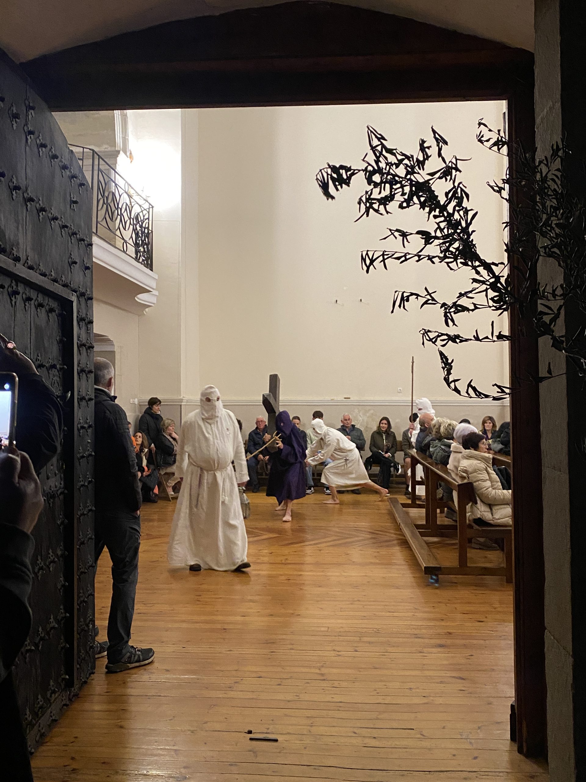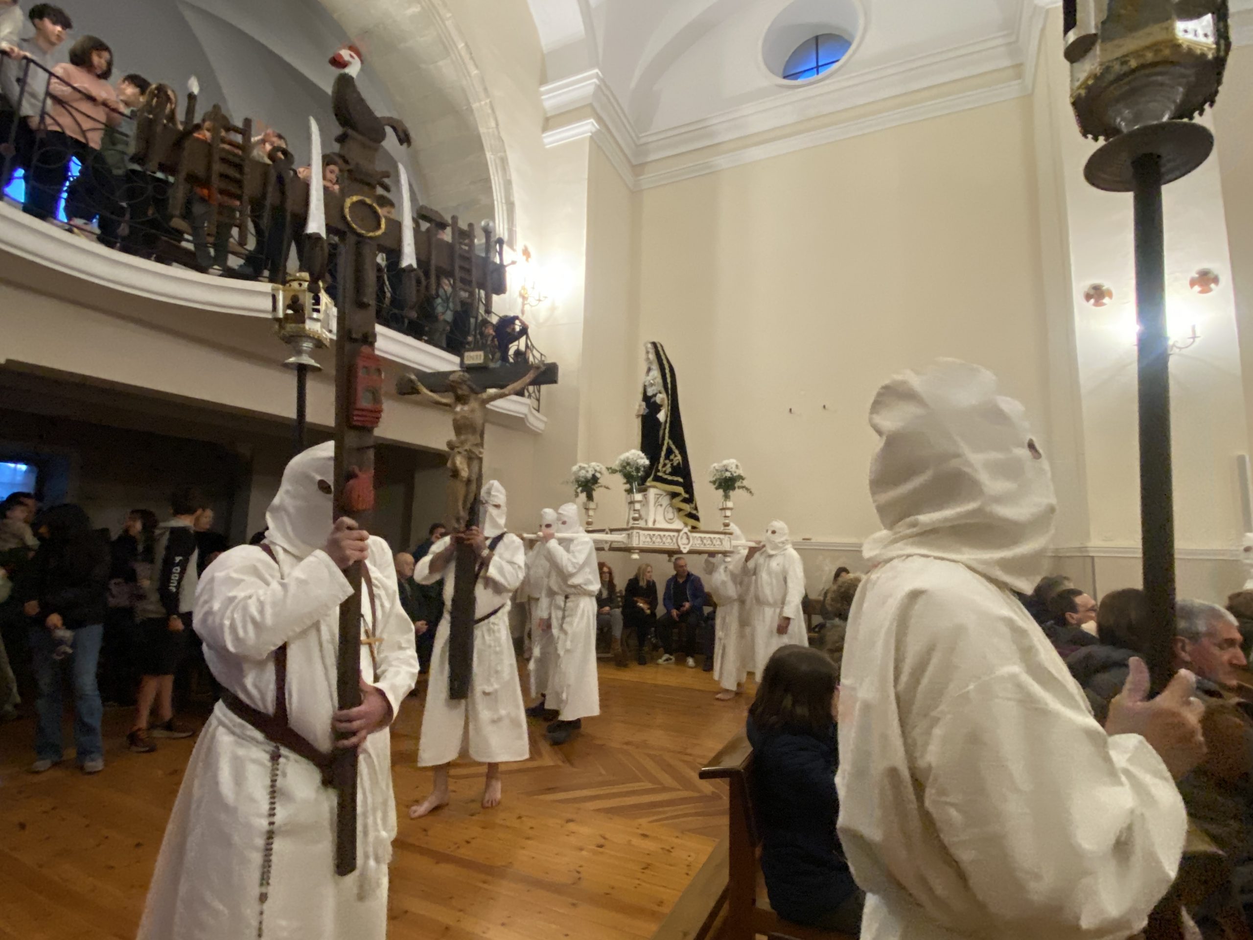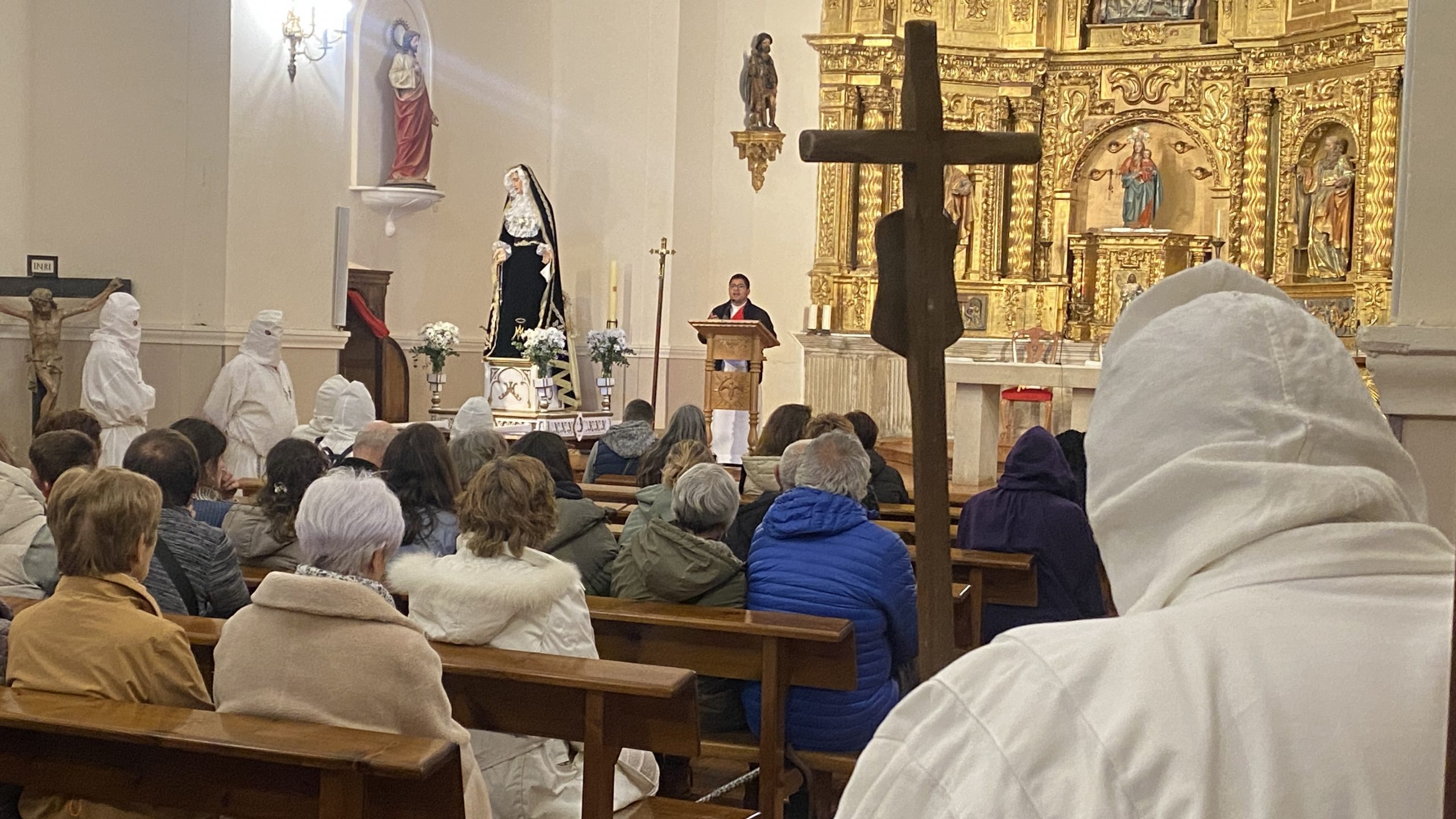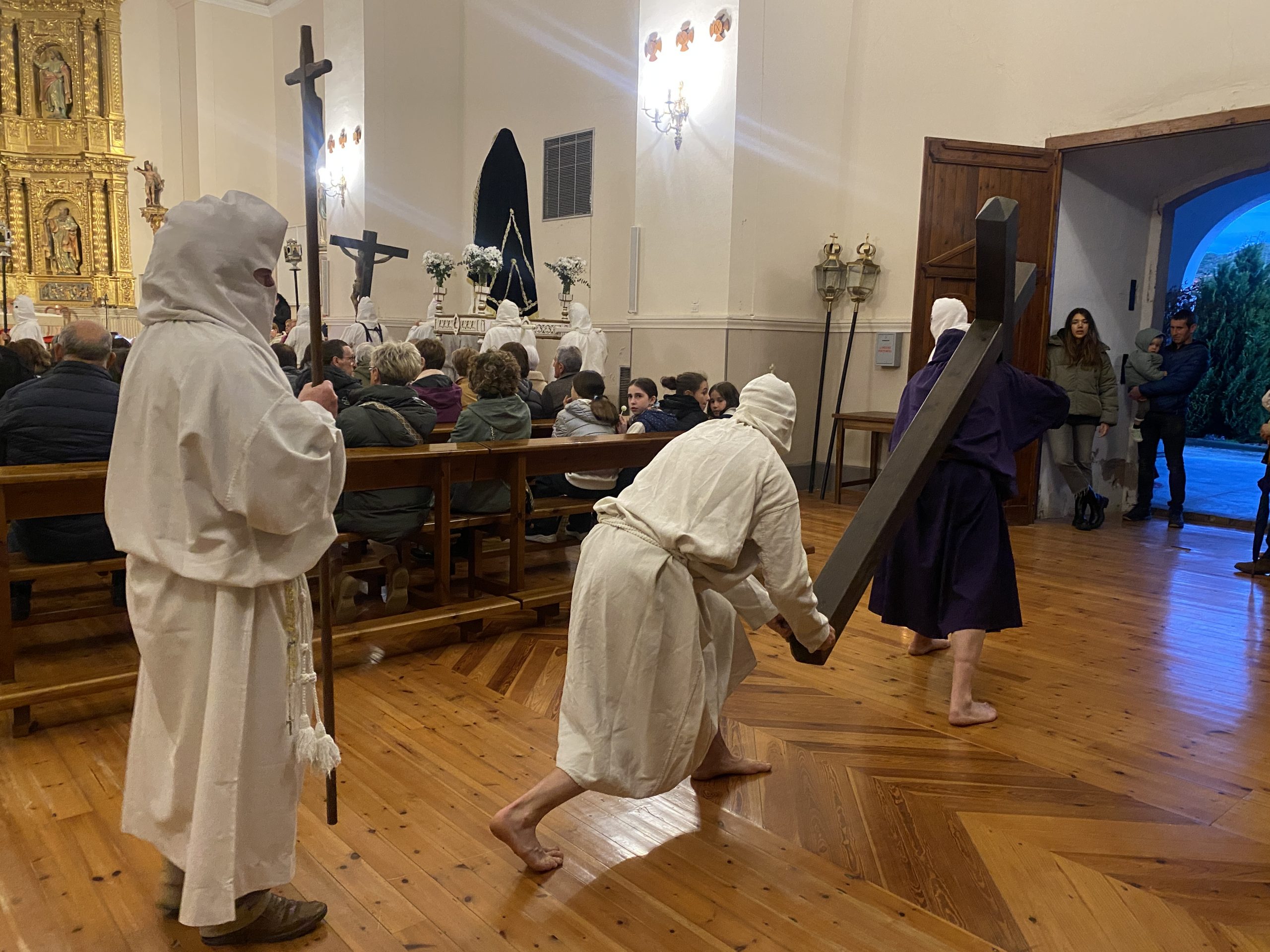 La Semana Santa era el momento más intenso. El Jueves Santo, todos los cofrades debían confesarse y comulgar. Ese día, además, se hacía una cena especial, muy simbólica: pan, alubias, higos secos, vino… sencilla, pero con mucho significado. Después, se vestían con las túnicas blancas, se cubrían el rostro y salían en procesión con las cruces y los símbolos de la Pasión. Uno representaba a Cristo con la túnica oscura y otro al Cirineo, que lo ayudaba a llevar la cruz.